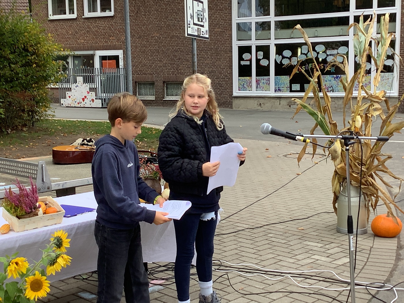 Auch in diesem Jahr feierten wir unser Herbstfest auf dem Schulhof. Moderiert wurde unsere Feier von einem Schüler und einer Schülerin des vierten Jahrgangs, die Vorbereitung übernahm Frau Stahl mit den Schülerinnen und Schülern des dritten Jahrgangs.