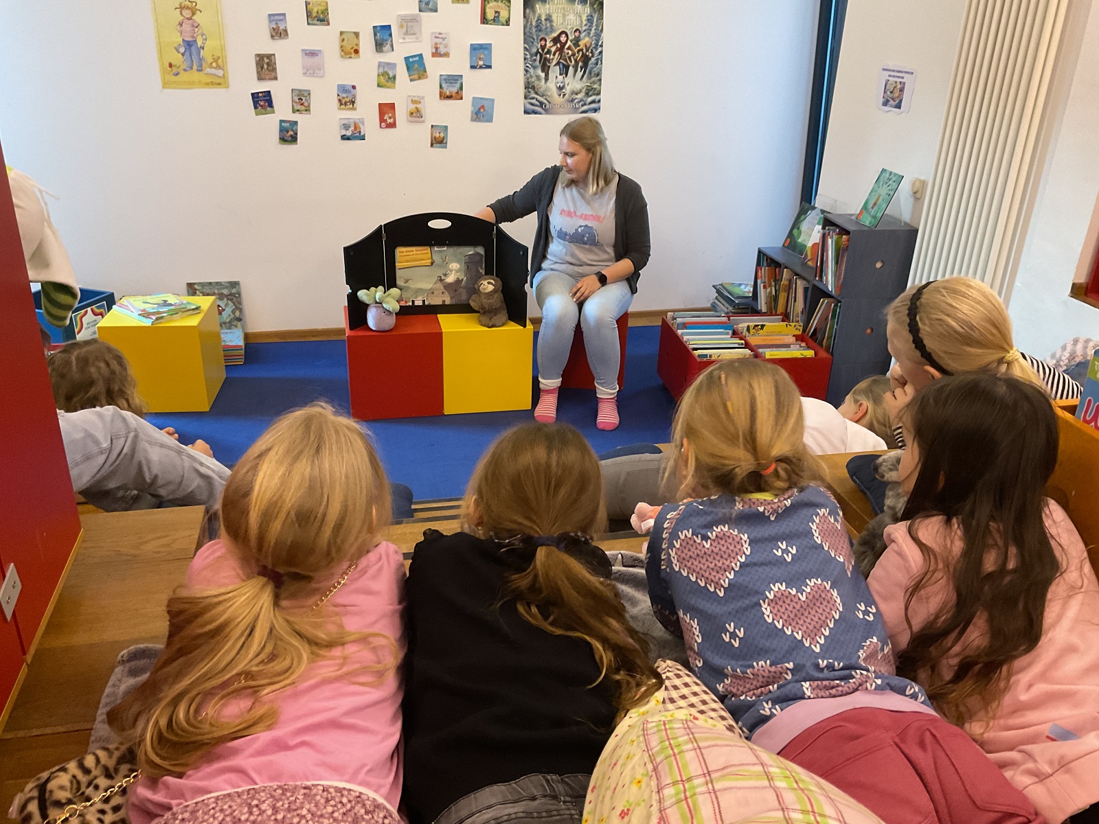 Mit dem Kamishibai erzählte Frau Tollkötter die Geschichte vom kleinen Gespenst. Kamishibai ist ein japanisches Erzähltheater, bei dem Bilderkarten in einem kleinen Holzrahmen gezeigt werden; die Erzählerin wechselt die Karten und begleitet sie mit gesprochenem Text – so entsteht eine besonders lebendige Vorführung. Die Atmosphäre war wunderbar kuschelig und alle hörten den Erzählungen aufmerksam zu.